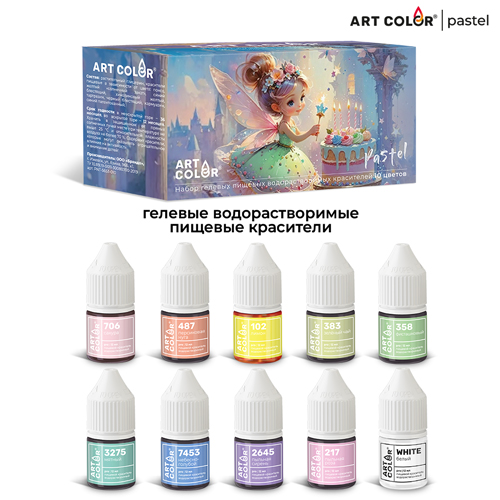 Набор гелевых водорастворимых пищевых красителей Art Color Pastel содержит 10 нежных трендовых оттенков для кремовой флористики - сакура, персиковая нуга, лимон, фисташковый, небесно-голубой, пыльная сирень, пыльная роза, мятный, зеленый чай, белый.